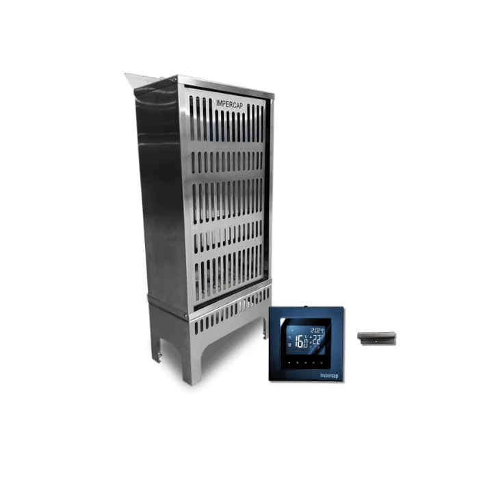 Os geradores de calor para sauna seca da Impercap são equipamentos nacionais fabricados totalmente em aço inox, com calha porta pedras, grade de proteção, cabos especiais em silicone resistentes ao calor, proteção térmica no fundo e acompanha um Painel de Comando Digital com garantia de 3 Anos contra defeito de fabricação para painel de comando e 1 ano de garantia contra defeito de fabricação para a sauna.