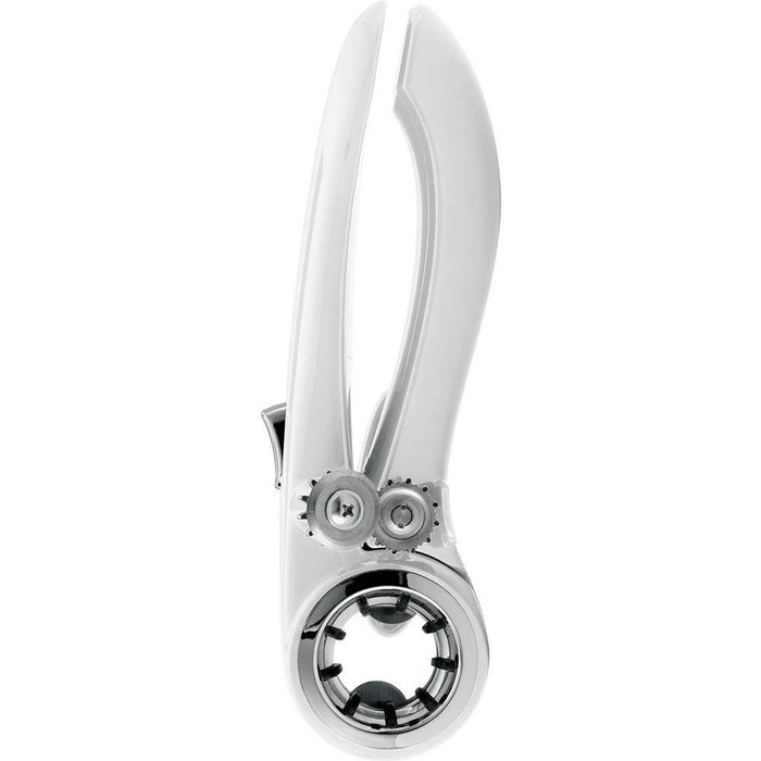 O Abridor de latas opera com grande fluidez, pois tem um mecanismo que facilita o movimento de girar as lâminas na lata. Também foi projetado com um abridor de garrafa tradicional acoplado.