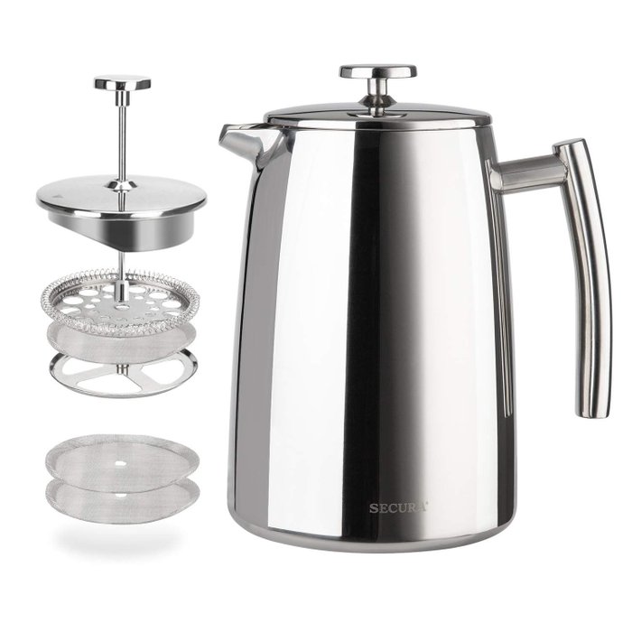 Secura Prensa Francesa em Aço Inoxidável 34oz com Filtro Extra (Prata)
