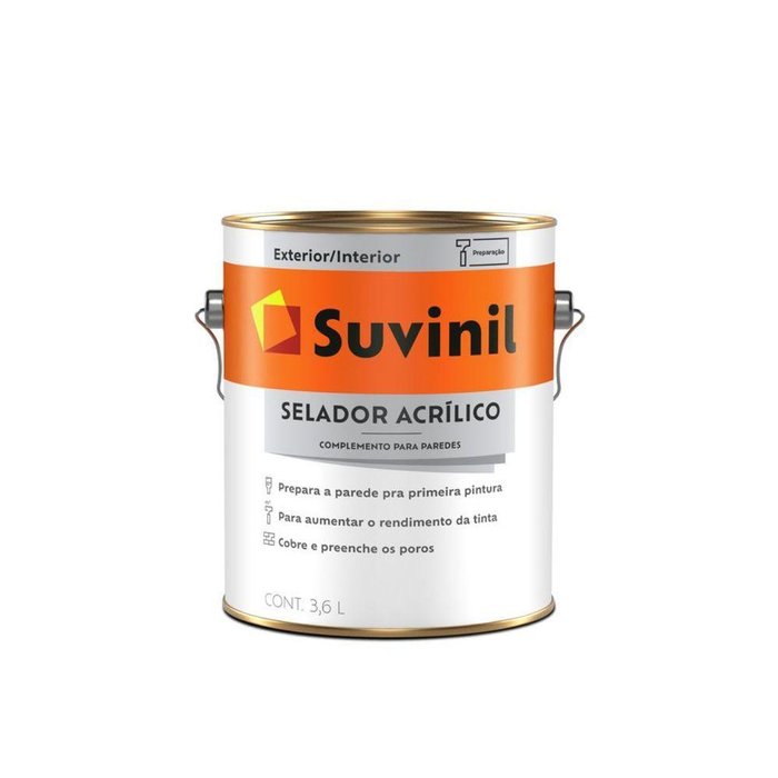 Benefícios Superfície Uniforme: Preenche os poros da parede, deixando-a uniforme e pronta para pintura. Aumento do Rendimento: Melhora a absorção da tinta, aumentando seu rendimento. Versatilidade: Pode ser usado antes da aplicação de massa corrida ou diretamente com tinta.Características e Diferenciais Qualidade Suvinil: Produto de alta qualidade desenvolvido para atender às necessidades de profissionais da pintura. Aplicação Profissional: Ideal para paredes internas que nunca foram pintadas. Fácil Aplicação: Simples de aplicar, garantindo uma preparação eficiente e rápida.Especificações Técnicas Marca: Suvinil Tipo de Produto: Selador Acrílico Conteúdo: 3,6 Litros Aplicação: Paredes internas Indicação: Paredes nunca pintadas, preparação para massa corrida ou pinturaPerguntas Frequentes Qual é o rendimento do selador acrílico? O rendimento pode variar conforme a porosidade da parede, mas geralmente uma lata de 3,6 litros cobre até 50 m² por demão. Posso usar o selador em áreas externas? Não, este produto é indicado para uso em paredes internas. Quanto tempo devo esperar para aplicar a tinta após o selador? O tempo de secagem pode variar, mas geralmente recomenda-se esperar de 6 a 12 horas antes de aplicar a tinta ou a massa corrida.