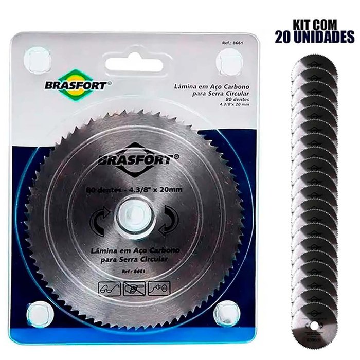 Serra Circular HSS 110 x 80D x 20 para Madeira Kit com 20 Unidades EVALD/BRASFORTPara madeira maciça, compensados, aglomerados, MDF, acrílicos e materiais não ferrosos.Aço carbono polido com revertimento em silver cromo antiaderente. DADOS TÉCNICOS:Contém: 20 unidades.Dentes: 80 (4.3/8 x 20 mm).Comprimento: 143 mm.Largura: 5 mm.Altura: 183 mm. Ref: 8661Marca: Brasfort *Imagens meramente ilustrativas.