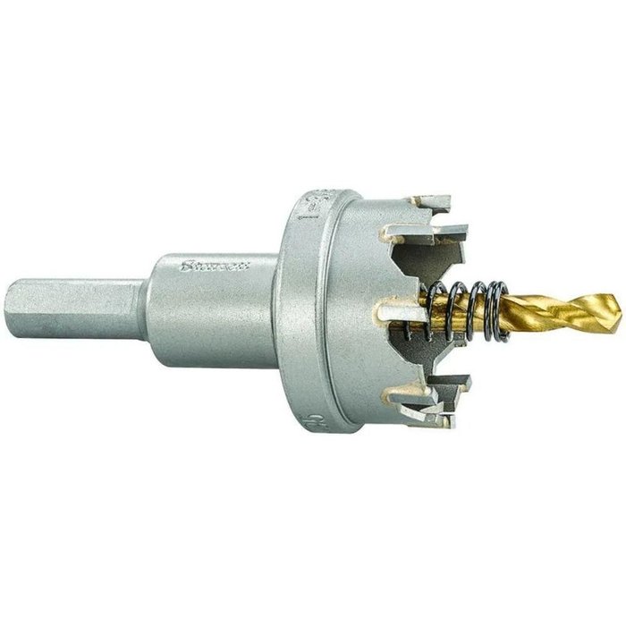 Serra Copo Tipo Fresa - SM Pastilhas de Metal Duro - 35 mm - STARRETT O QUE É A SERRA COPO TIPO FRESAA serra copo tipo fresa é uma ferramenta de corte projetada para perfurar materiais de forma eficiente, combinando características de uma serra copo com a capacidade de fresamento. Diferente das serras copo tradicionais, que cortam em um movimento circular contínuo, a serra copo tipo fresa possui dentes ou lâminas que permitem cortes mais precisos e rápidos em diversos materiais, como madeira, plástico, metais finos e gesso. Esta ferramenta é ideal para criar furos de maior diâmetro com bordas mais limpas e precisas, sendo amplamente utilizada em trabalhos de construção, marcenaria e bricolagem. COMO UTILIZAR A SERRA COPO TIPO FRESAPara utilizar a serra copo tipo fresa, fixe-a firmemente no mandril da furadeira, marque o ponto exato de perfuração, e ajuste a velocidade da furadeira conforme o material a ser cortado. Posicione a serra copo perpendicularmente à superfície e inicie a perfuração com pressão moderada, mantendo uma velocidade constante. Use fluido de corte ou água para resfriar a ferramenta e evitar superaquecimento, parando periodicamente para limpar os resíduos acumulados. Após o corte, desligue a furadeira, retire a serra copo e limpe a área de trabalho. ESPECIFICAÇÕES DA SERRA COPO TIPO FRESADiâmetro em milímetro: 35Diâmetro em polegadas: 1.3/8Modelo: Tipo Fresa - SMTipo de lâmina: Pastilhas de Metal DuroCódigo:SM35Marca: STARRETT