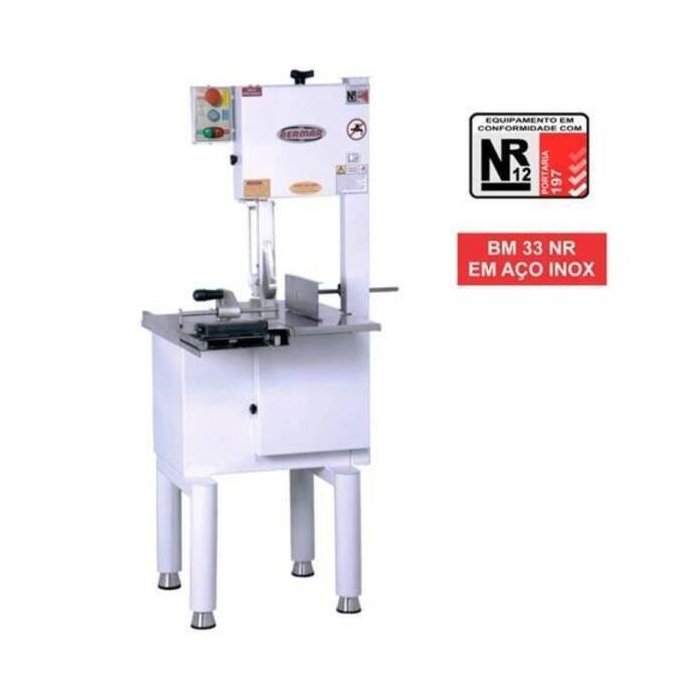 • BM 33 NR • Motor: 368W – 60 Hz • Monofásico • Consumo: KW/h 0,35 • Com dispositivo de segurança • Com mesa móvel • Comprimento da lâmina 2,20m • Corte com altura de 280mm • Dimensão da mesa 590x700mm • Estrutura em Inox