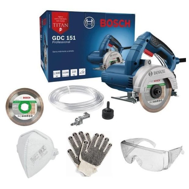 Serra Mármore Bosch GDC Titan 151 com Kit Refrigeração EPI e 02 Discos Bosch A Nova Serra Mármore TITAN GDC-151 da Bosch é a Melhor, mais Potente, mais Leve, e com o maior Alcance e Capacidade de Corte da categoria. Este Novo Lançamento da Bosch veio para revolucionar a categoria de Serras Mármore do Mercado, e foi projetada exclusivamente para atender as necessidades dos usuários. A Versão Titan GDC151 acompanha Kit de refrigeração para cortes a úmido e Chave Exclusiva Bosch para troca rápida e simples de discos, com apenas uma mão. A Nova Serra de Mármore TITAN da Bosch veio para ser A Melhor Serra Mármore do Mercado, ela oferece Durabilidade, Praticidade, Conforto, Segurança e Alto Desempenho. É a Serra para mármore mais Leve, Potente, e com o maior Alcance de Corte da categoria, comparada as principais concorrentes. Ideal para Marmorarias, Construção Civil em geral, Pedreiros, Azulejistas, Encanadores, Eletricistas e Instaladores de Cerâmica. Principais Benefícios da Serra Mármore Titan Bosch GDC151 - A Serra Mármore Mais Potente da Categoria, com 1500W e 12.200 rotações por minuto. Força e Velocidade no trabalho. - A Mais Leve, pesando apenas 2,6 kg. Com Design Compacto e Ergonômico. - Com o Maior Alcance, Capacidade e Profundidade de Corte, corte reto de 90° ou em ângulo de 45°. - Placa Base com Maior Visibilidade de Corte e Alcance (Até a Parede). Placa base Patenteada pela Bosch, menor que os modelos antigos e da concorrência. Vai onde as outras não vão. - Com Gatilho grande para dois dedos (não permite o acionamento involuntário) e empunhadura com Soft grip, oferecendo maior controle, conforto e segurança. - Troca de disco simples e rápida. Patente exclusiva Bosch. Chave única e exclusiva para troca rápida de discos. Possibilita trocar discos com apenas uma mão e uma chave. Aplicações da Nova Serra Mármore Titan da Bosch - Cortes retos, curvos e em ângulos. - Cortes de pisos e revestimentos, lajotas, tijolos, telhas, mármore e granito em geral. - Cortes de pias, rodapés, soleiras e corrimãos. - Cortes de paredes (Tijolos, Alvenaria etc.) para instalação de conduíte e tubulação de água. - Corte em madeira. Características da Serra Para Mármore Bosch Titan GDC 151 - Tensão: 110V ou 220V - Potência: 1.500 W - Rotação: 12.200 rpm - Capacidade Máxima de corte: 90º - 40,3 mm / 45º - 26 mm - Capacidade máxima de disco: 125 mm - Capacidade mínima de disco: 105 mm - Peso: 2,6 kg Acompanham: - 02 Discos Corte Cerâmica Bosch 105mm Fast Cut - Kit Água (refrigeração) para cortes a úmido - Chave Exclusiva Bosch para troca de discos