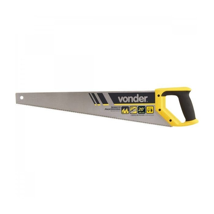 | Informações Complementares | Material da lâmina do serrote: Lâmina de aço temperado / Material do cabo do serrote: Plástico rígido ABS / Comprimento de corte do serrote: 20" - 508 mm / Número de dentes por polegada: 7 dentes |