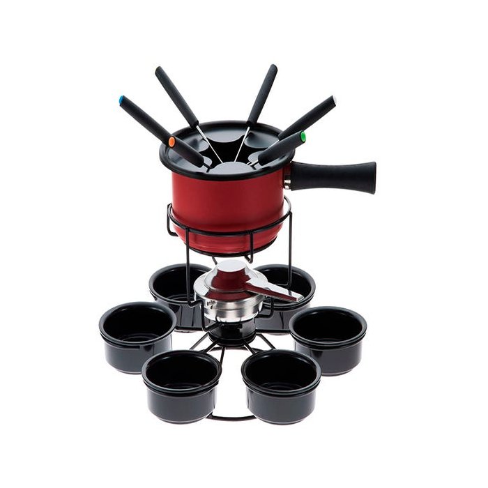 Serviço Fondue Aspen anti-aderente Carrousel Vermelho 16 peças Forma 1 litro / ∅17 cm 1 panela alumínio 1 separador de garfos 1 tripé giratório 1 queimador 6 molheiras 6 garfos