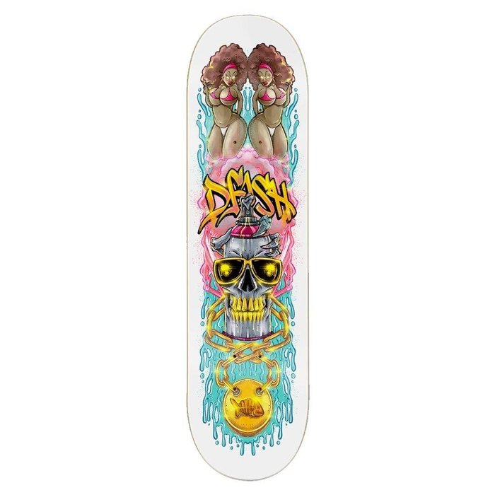 A linha de Shapes de Marfim da Dirty Fish conta com a tecnologia Fiber Glass, que é um grande diferencial e exclusividade da marca. O shape possui 7 lâminas de marfim calibradas, prensadas com resina epóxi e fibra de vidro, se caracterizando assim em "FIBER GLASS". Isso resulta em uma alta resistência, rigidez e durabilidade do produto. Nossa prensa possui ângulos perfeitamente projetados para não ter nenhuma parte reta no shapes, isso diminui a área de contato com as superfícies, principalmente em manobras de tail e nose, deslizando mais fácil nos obstáculos. Também conta com um acabamento impecável nas bordas, além de corte e furações feitos em CNC, deixando seu shape sempre uniforme para as sessões. Nossa estampa é feita com uma tecnologia inovadora, desenvolvida pela própria Dirty Fish, um HEAT TRANSFER feito em tinta UV, sendo sustentável e livre de solventes. Isso garante uma melhor resolução da estampa, alta durabilidade de uso e menor desgaste em impactos, além de fazer seu shape deslizar ainda mais nas manobras, já que não se trata de um papel que descasca, mas sim, de uma tinta aplicada diretamente na madeira. Composição do produto 7 Lâminas calibradas de Marfim; Resina Epóxi com fibra de vidro; Estampa em Heat Transfer UV; Certificado de garantia. Dados técnicos do produto Capacidade suportada nas bases: 130kg. Observação: O erro na execução de manobras (finalizações fora das bases), até para pessoas mais leves, pode ocasionar em quebra do shape, o que não é passível de troca, já que o mesmo é feito para ter pop (pressão) e não para ser inquebrável. ATENÇÃO: O shape não acompanha lixa; este anúncio é apenas do shape, não é um skate completo. ATENÇÃO: Só será efetuada a TROCA em caso de abertura de lâminas ou problemas na furação. ATENÇÃO: NÃO TROCAMOS SHAPES QUEBRADOS.