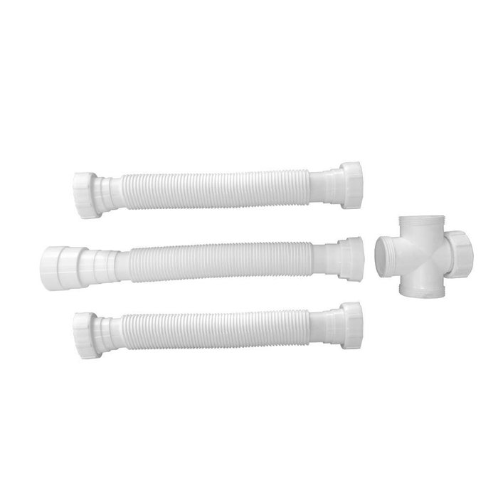 Sifão triplo sanfonado, próprio para cubas/pias/tanques triplos, ligando três cubas a um único esgoto. Também pode ser usado para ligar cuba dupla e calha úmida em um único ponto de esgoto.
