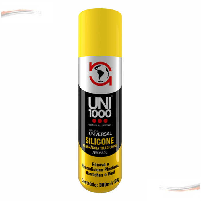 Silicone Spray UNI1000 ------------------------------------------------------------------------------------------------------------------- Desenvolvido para a lubrificação de superfícies metálicas e não metálicas, plásticos e borrachas, para facilitar o encaixe de peças diversas. Proporciona brilho e conservação para automóveis, móveis e superfícies em geral, além de agente de proteção contra umidade e ferrugem em superfícies diversas. ------------------------------------------------------------------------------------------------------------------- Principais vantagens:- Alta performance;- Proteção contra raios ultravioleta;- Lubrifica;- Limpa e dá brilho;- Resistente a umidade;- Protege contra a maresia.