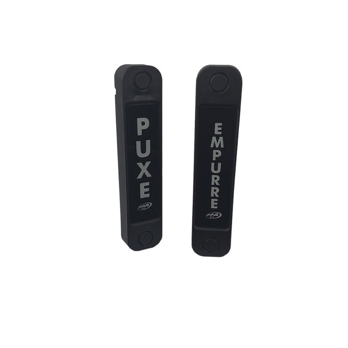 O Puxe Empurre consiste em um par de produtos sinalizadores, cada um com sua caixa plástica e saída com fio para alimentação, com os seguintes dizeres luminosos PUXE e EMPURRE, uma vez instalada junto a porta automática, no momento da abertura da porta o sistema de controle da fechadura eletroimã irá cortar a alimentação da mesma e enviar para o Puxe/Empurre que irá acender e indicar para o usuário que a porta está liberada