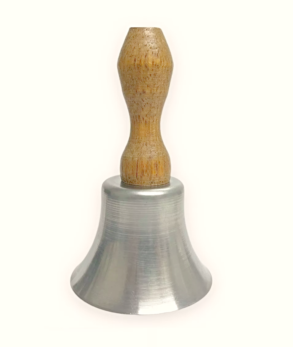 Sino com cabo de madeira.Corpo em Alumínio grosso o que proporciona sonoridade mais alta que aqueles confeccionados em chapa de parede fina.Excelente para hóteis, recepções, etc