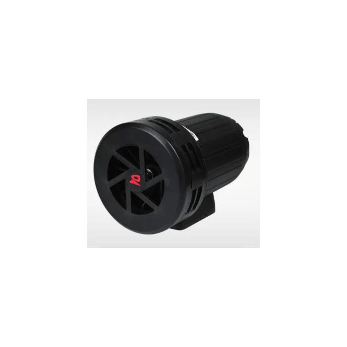 Sirene eletromecânica unidirecional montada em tubo de alumínio extrudado com superfície pintada em preto. Possui flange, hélice, tampa frontal, tampa traseira e base de fixação injetada em nylon com fibra de vidro.
