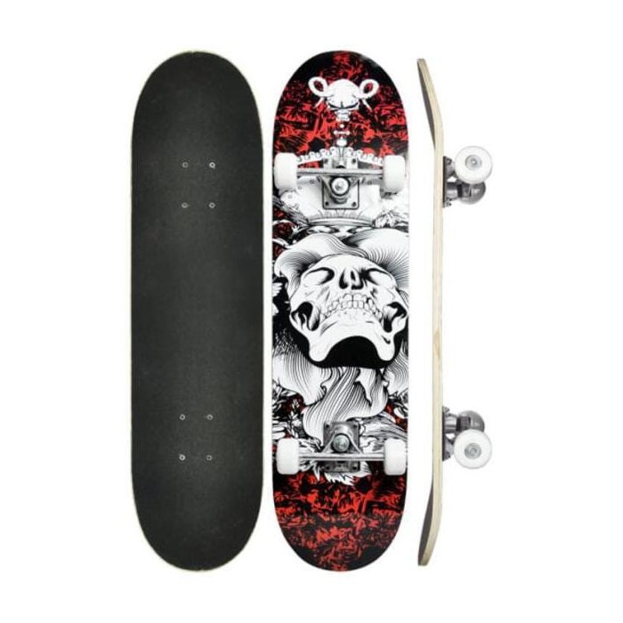 Kit Skate infantil com estampa de uma caveira branca com capacete e acessório para aqueles que gostam de aventuras radicais. A criançada que curte vai querer ter esse skate e fazer altas manobras com ele. Ele é fabricado em material bastante resistente, suportando os jovens na hora de darem um ollie, flip ou slide, dentre outras manobras, com seus quatro rolamentos. Perfeito para aqueles que desejam dar os passos iniciais como skatista como também os que já têm experiência.