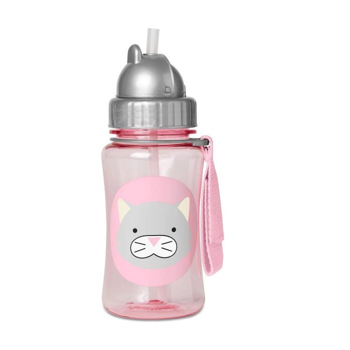 A garrafinha com canudo ZOO da SkipHop possui uma tampa flip-flop, que pode ser lavado em máquina de lavar louça e vem com um canudo extra.