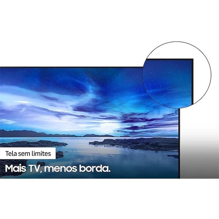 Smart TV Samsung 43" LED Ultra HD 4K UN43AU7700 Tela sem limites Mais TV, menos borda Com uma exclusiva tela sem bordas aparentes, a TV destaca apenas as imagens que você quer ver e nada mais. Atividades pela TV5 Divirta-se em casa Com a TV Samsung, você aproveita não apenas da melhor qualidade de imagem, mas também curte no conforto da sua casa diferentes atividades como: acesso a canais gratuitos, videoconferências na tela grande, acesso remoto ao seu PC e conectividade entre aparelhos.