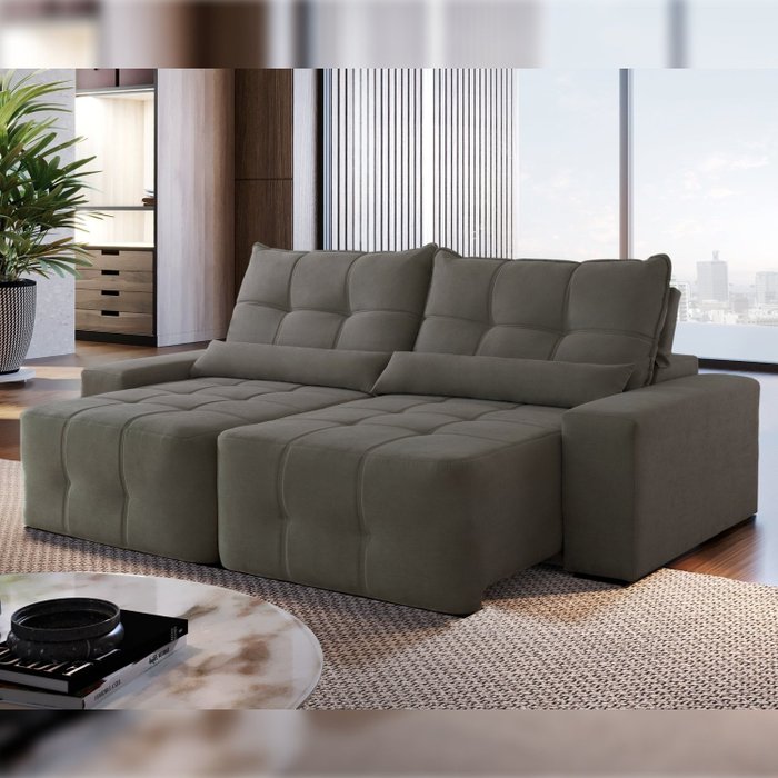 O assento de pillow com espuma elática e molas pocket. Possui mecanismo retrátil em aço que permite abertura do sofá para seu bem-estar.