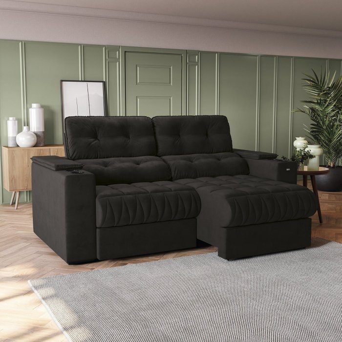 Sofá 230cm com Porta Copos Retrátil e Reclinável Premier Veludo Preto