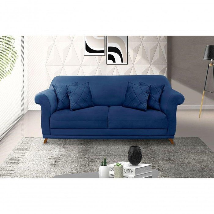 Sofá 3 Lugares 2,00 M Azul Marinho Com Pés De Madeira E 2 Almofadas Antibes Zahav Estofados