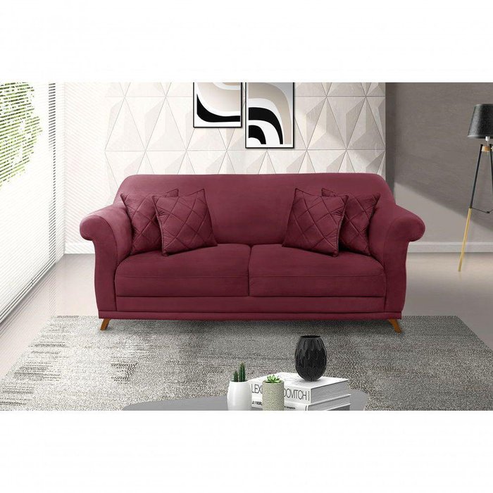 Sofá 3 Lugares 2,00 M Veludo Vinho Com Pés De Madeira E 2 Almofadas Antibes Zahav Estofados
