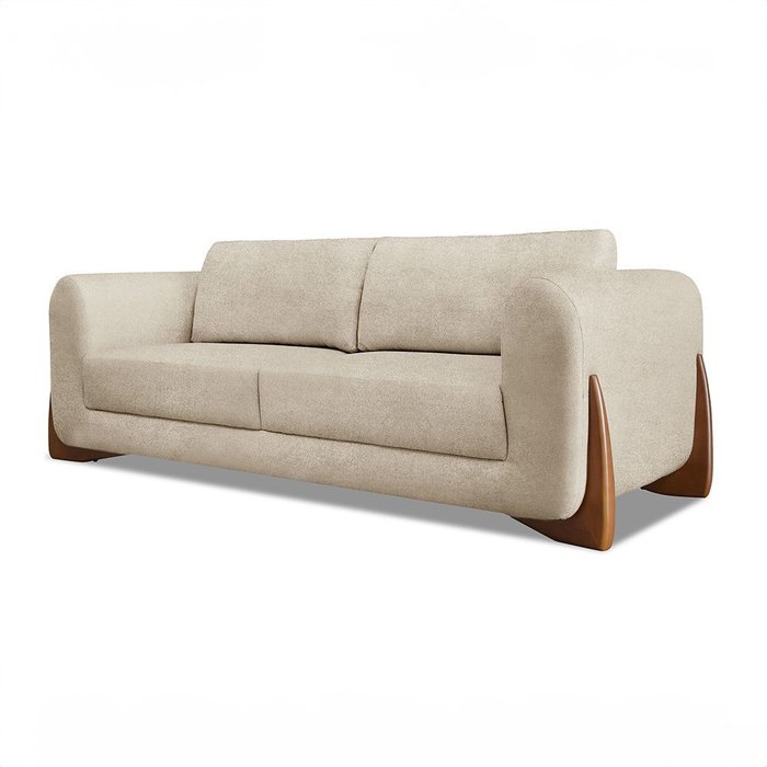 Sofá 3 Lugares 2,30m Linho Bouclé Bege com Detalhes em Madeira - Jobim Lucadi Home