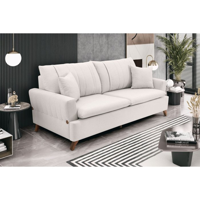 Eras 3 Lugares é um requinte de sofá, estrutura de madeira de eucalipto proveniente de reflorestamento, montagem com grampos galvanizados, encosto fixo com cintas elásticas e almofadas soltas com enchimento de fibra siliconada e flocos de espuma, assento fixo com cintas elásticas e almofadas soltas com enchimento espuma HR 26 plumante. Suporta até 110 kg por assento, braças com espuma D20 e botões decorativos. Revestimento em tecido 66% algodão e 34% poliéster. Pés de madeira. Acompanha 2 almofadas decorativas