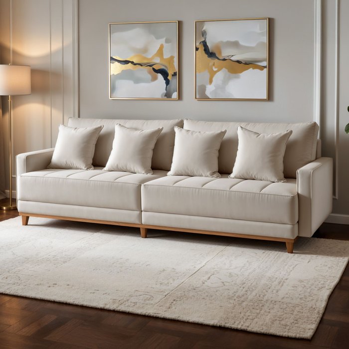 Um sofá que une beleza, conforto e praticidade: nosso modelo já vem com 4 almofadas decorativas, trazendo charme e aconchego para a sua sala. O braço slim de 10 cm deixa o ambiente mais moderno, enquanto o encosto fixo com almofadas removíveis facilita a limpeza e ainda permite reorganizar a decoração sempre que quiser. O detalhe debrum garante elegância e o assento com mola bonnel garante qualidade e bem-estar. Para completar, a base e os pés em madeira maciça unem resistência, durabilidade e elegância, sendo também uma escolha ecologicamente correta. Um sofá que transforma sua sala em um espaço aconchegante e cheio de estilo.