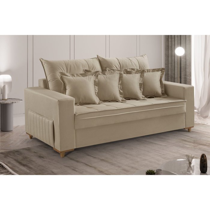 Sofá 3 Lugares Beny 200cm com Almofadas e Pés de Madeira Bege