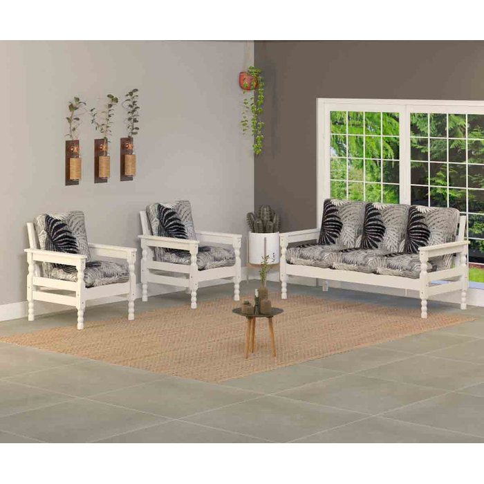 Sofá 3 Lugares e 2 Poltronas Madeira Maciça com Almofadas Branco