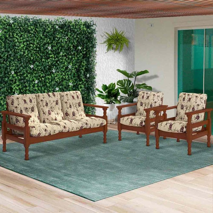 Sofá 3 Lugares E 2 Poltronas Madeira Maciça Com Almofadas Mel Sevilha Belini Móveis Mel