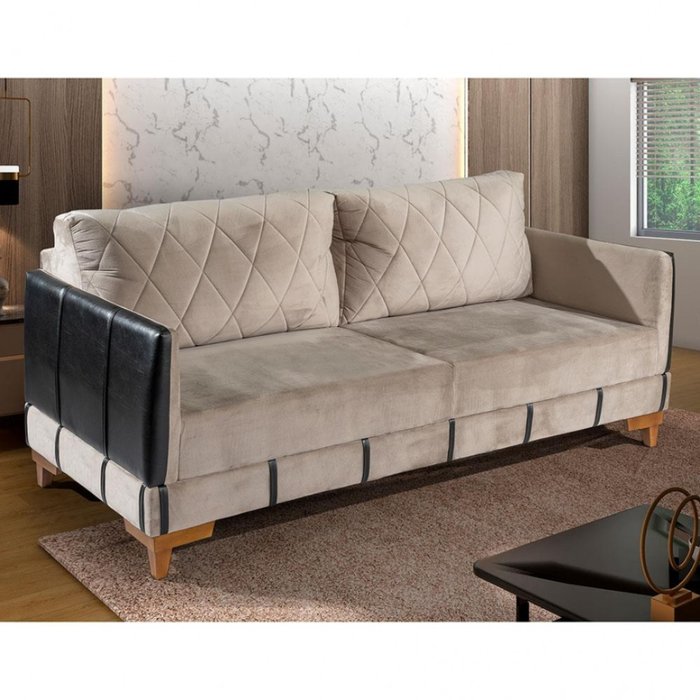 Sofá 3 Lugares Mônaco em Veludo e Sintético Boutique Bege e Preto