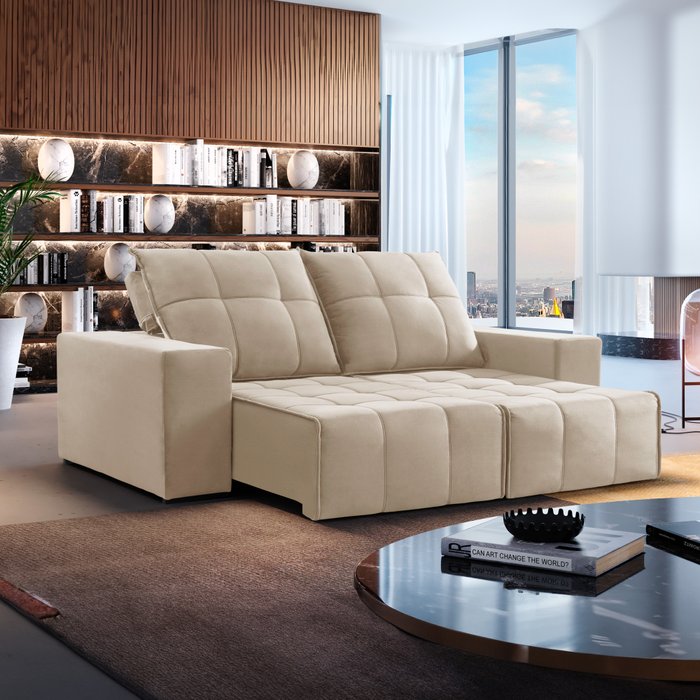 Sofá 3 Lugares Retrátil e Reclinável Super Pilow 205cm Xangai Yescasa Veludo Bege Claro
