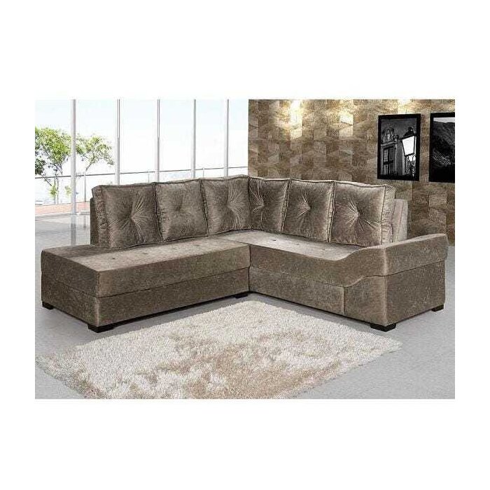 Tecido suede amassado 100% poliéster em sua composição, assento com persinta elástica e manta de tnt e mola espiral, espuma assento d23, espuma encosto d18, almofadas soltas, com flocos de espuma mesclada com fibra siliconada e e.v.a. em sua composição. Madeira de reflorestamento (eucalipto e pinus)