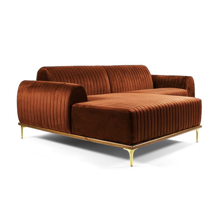 Sofá 4 Lugares 2,30M Chaise Direito Molino Base Madeira Pés Gold Veludo Camel - Casaepoltrona