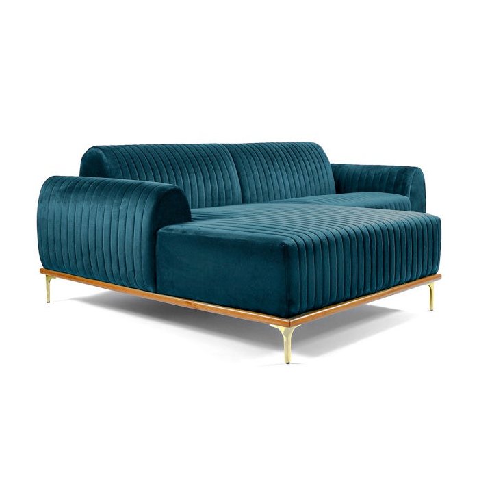 Sofá 4 Lugares 2,30M Chaise Direito Molino Base Madeira Pés Gold Veludo Turquesa