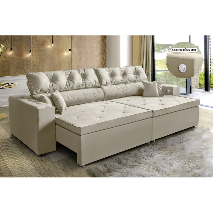 Sofá 4 Lugares Smart 2,62 Metros Bege Retrátil, Reclinável Tecnologia Carregamento 3 portas USB