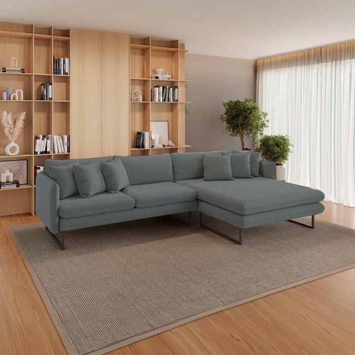 Sofá com chaise de espuma d28 macia e almofadas soltas no encosto, proporcionando várias posições para conforto. Os braços finos valorizam o ambiente, aumentando o espaço interno do produto. Os pés são metálicos.