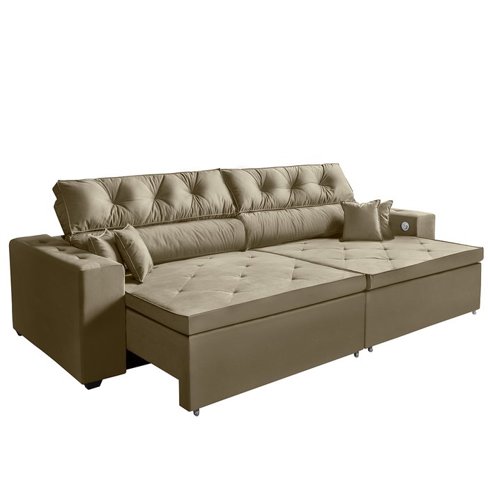 Ele possui encosto reclinável em cinco posições, proporcionando-lhe mais conforto na hora do descanso. E não para por aí: seu assento retrátil conta com espuma D28 e molas espirais, transformando seu sofá em uma verdadeira cama para assistir seu filme preferido.