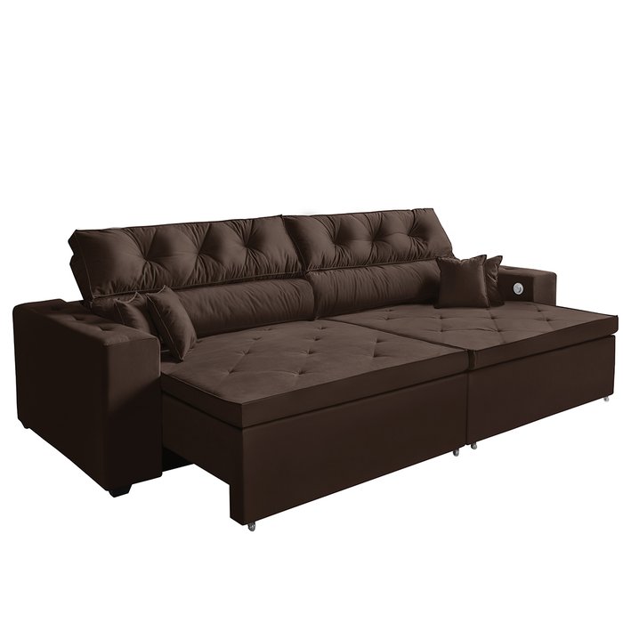 Ele possui encosto reclinável em cinco posições, proporcionando-lhe mais conforto na hora do descanso. E não para por aí: seu assento retrátil conta com espuma D28 e molas espirais, transformando seu sofá em uma verdadeira cama para assistir seu filme preferido.
