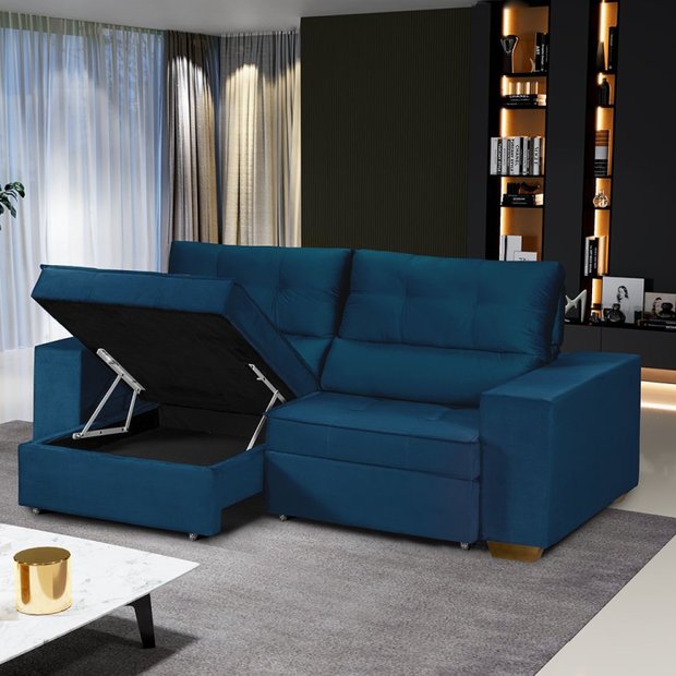 Sofá Baú Retrátil e Reclinável 5 Lugares 250cm Veludo Nobre La Plata Yescasa Azul