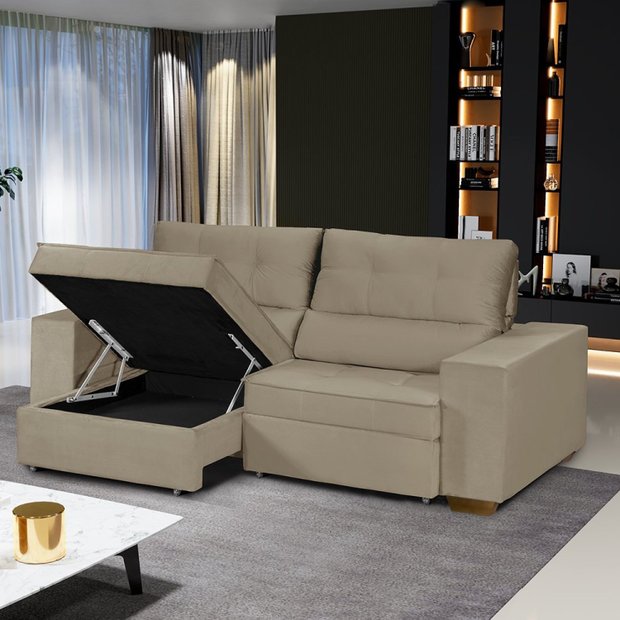 Sofá Baú Retrátil e Reclinável 5 Lugares 250cm Veludo Nobre La Plata Yescasa Bege
