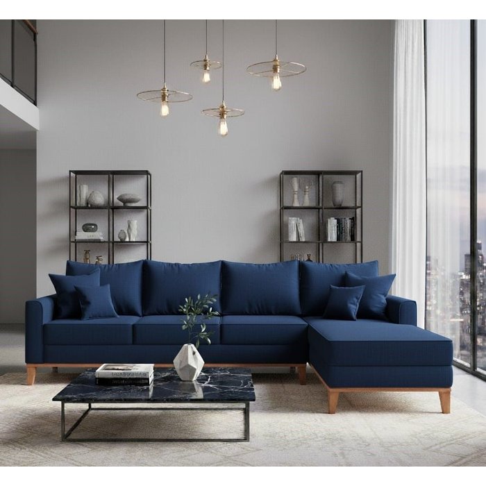 Sofá Beny com Chaise Direita, 2,60x1,40m, 4 Lugares, Linho, Base em Madeira. Azul