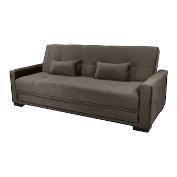 Feito com madeira de reflorestamento de alta qualidade, ele conta com visual de sofá mas que se transforma em cama quando necessário, basta reclinar seu encosto. A sua estrutura foi projetada para acomodar até três pessoas como sofá e duas como cama. E mais, ele vem acompanhado de duas almofadas.