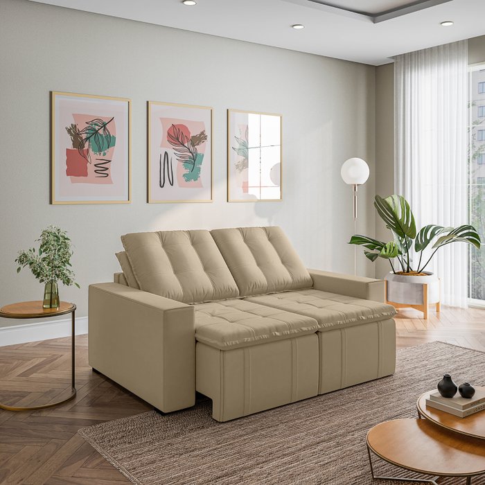 Sofá Cama Retrátil e Reclinável 3 Lugares 180cm em Veludo Palmeira CabeCasa MadeiraOriginals Bege