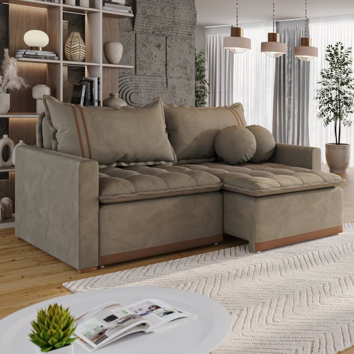Transforme sua sala com o equilíbrio perfeito entre aconchego e elegância. Com 220cm de largura, o Sofá Flórida acolhe a rotina com encostos em fibra siliconada — macios e envolventes — e assento firme na medida certa. O revestimento em Veludo adiciona textura e sofisticação, fácil de combinar com diferentes estilos de decoração. Retrátil, ele se estende para momentos de relax e, quando necessário, vira um sofá-cama amplo e confortável, ideal para receber visitas ou maratonar séries com todo mundo à vontade. Os braços quadrados de 15cm arrematam o visual contemporâneo e garantem apoio prático no dia a dia.
