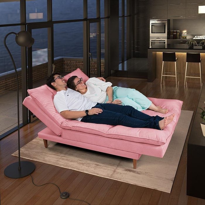 Sofá Cama Vancouver 3 Lugares Império Reclinável Casal Pés Madeira Suede Rosa 200