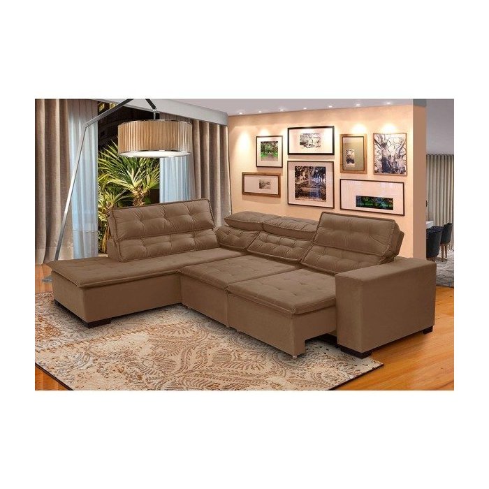 Sofá Canto Chaise 2,80M x 2,20M Retrátil Mola Bonnel Pillow D28 Stillo Veludo Bege Escuro - Grandell