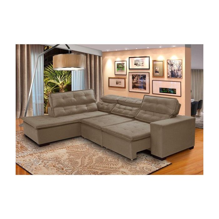 Sofá Canto Chaise 2,80M x 2,20M Retrátil Mola Bonnel Pillow D28 Stillo Veludo Bege - Grandellar