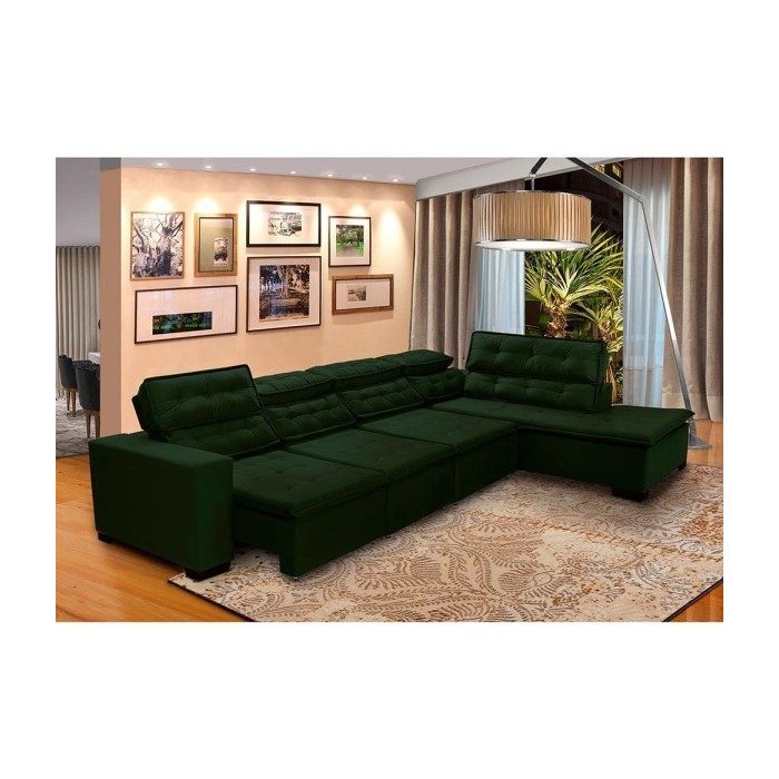 Sofá Canto Chaise D 3,60M x 2,20M Retrátil Mola Bonnel Pillow D28 Stillo Veludo Verde - Grandellar