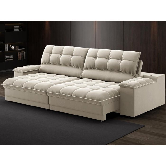 Sofá com Porta Copos e Carregador Usb Ret Rec Luke 2,90m Veludocristal Areia - Netsofas