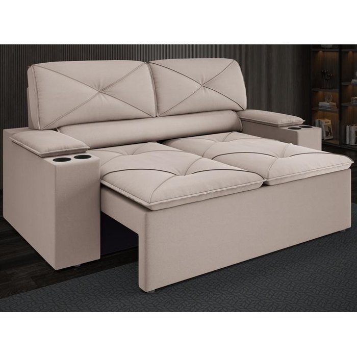 É na sala de estar onde a maior parte dos momentos de lazer da família acontece. Seja curtindo um filminho, jogando aquele lançamento dos games ou recebendo amigos para um café, por isso é essencial ter um sofá para acomodar todos bem. Espaçoso, bem estruturado e com um design para deixar o lar-style perfeito, o modelo POP tem assento retrátil com porta copos nos braços, o que faz dele uma peça ótima para oferecer aquele aconchego extra. Revestido velosuede, sendo ideal para te inspirar e dar aquela mãozinha na hora de criar o ambiente dos sonhos. Informações técnicas:Material da estrutura: Madeira Maciça de Eucalipto 100% de reflorestamento, produto ecologicamente correto.Enchimento do Assento: Espuma D-28, Percinta Elástica.Enchimento do Encosto: Percinta Elástica, Flocos de Espuma e Fibra de Poliéster Siliconada.Fixação da Estrutura: Grampos galvanizados antiferrugem.Revestimento / Tecido: Velosuede.Chaise: Não Possui. Medidas:Altura aproximada: 100cm (fechado) e 86cm (aberto).Largura aproximada: 154cm.Profundidade aproximada: 87cm (fechado), 138cm (aberto)Peso aproximado: 43,10kg.Necessita Montagem: Sim.Necessita Montador Especializado: Não. A montagem do produto pode ser feita facilmente seguindo o manual de instruções que acompanha a embalagem do produto. Não é necessário técnico especializado.Capacidade em KG por Lugar: Aproximadamente 100kg Porta Copos: Sofá possui quatro porta copos fixos (dois em cada braço). As dimensões do porta copo são aproximadamente 10cm x 5cmGarantia: 90 dias contra defeito de fabricação. *a contar da data do recebimento da mercadoria.Limpeza: Aspirar o Produto para eliminar a poeira, utilizar um pano levemente umedecido com água e sabão neutro, seguido de pano seco. Não limpar com escovas ou produtos abrasivos.Recomendações de Manutenção: Usar em local seco, não molhar. Evitar exposição ao sol, para que o produto não sofra alterações na cor. ATENÇÃO!A tonalidade do produto pode sofrer variações entre a imagem de exibição e o item físico. Imagens meramente ilustrativas.Não nos responsabilizamos pela montagem/instalação dos produtos.Os objetos que ambientam as fotos não acompanham o produto.Verifique as dimensões do produto e certifique-se que o percurso que ele fará até o local de uso permite sua passagem. Nós não nos responsabilizamos por transporte de produtos, caso não caibam em elevadores, acima de três lances de escada e não cabendo na passagem das escadas, por içamentos ou desmontagens de produtos. Quaisquer despesas deste tipo ficam a cargo do cliente.Reservamo-nos o direito de possíveis erros de digitação. Anúncio sujeito a alteração sem aviso prévio.Antes da entrega, nossos produtos passam por um rigoroso controle de qualidade para que cheguem até o cliente em perfeitas condições, entretanto, em casos de desacordo com o proposto, o comprador deverá contatar o nosso SAC e/ou a loja aonde a compra foi efetuada.Sofá com Porta Copos. Possuem porta copos fixos no braço. As dimensões do porta copo são aproximadamente 10cm x 5cmO prazo para solucionar os problemas identificados é de até 30 dias úteis, contados a partir da data do posicionamento do SAC com o comprador.
